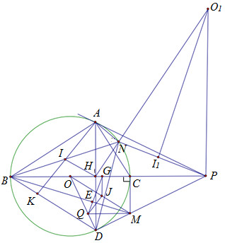 Cho tam giác ABC vuông tại A \(\left( {AB > AC} \right)\) nội tiếp đường tròn \(\left( O \right)\), đường cao AH. Gọi D là điểm đối xứng với A qua BC. Gọi K là hình chiếu vuông góc của A lên BD. Qua H kẻ đường thẳng song song với BD cắt AK tại I. Đường thẳng BI cắt đường tròn \(\left( O \right)\) tại N (N khác B).