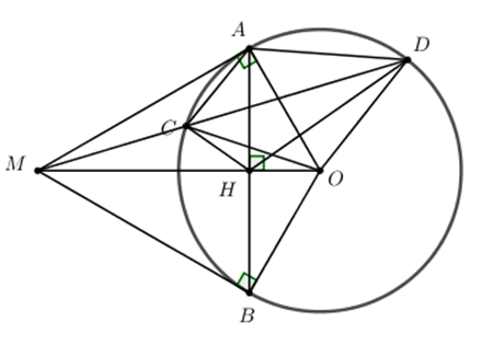 d) AB cắt MO tại H. Chứng minh \(\angle HDC=\angle HOC\)