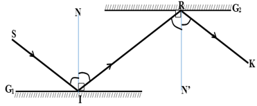 Hai gương phẳng G1 và G2 đặt song song với nhau, mặt phản xạ quay vào nhau. Tia tới SI được chiếu lên gương G1phản xạ một lần trên gương G1 và một lần trên gương G2 (hình vẽ). Góc tạo bởi tia tới SI và tia phản xạ cuối cùng trên gương G2 có giá trị nào sau đây?