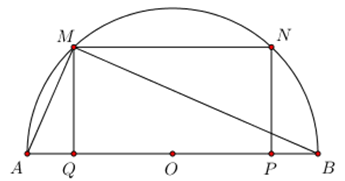 2) Cho nửa đường tròn đường kính AB = 2R. Tìm kích thước hình chữ nhật MNPQ có hai đỉnh M, N thuộc đường tròn, hai đỉnh P, Q thuộc đường kính AB sao cho diện tích MNPQ lớn nhất.