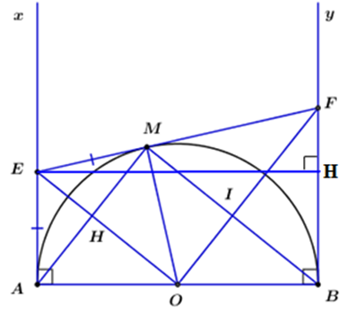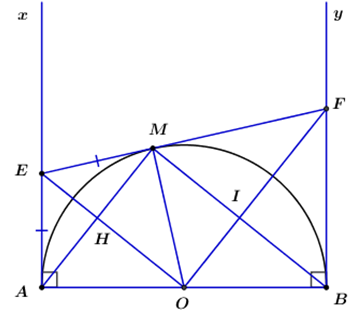 Cho nửa đường tròn \(\left( O;\ R \right)\) đường kính \(AB,\) vẽ hai tiếp tuyến \(Ax,\ By\) với nửa đường tròn. Trên tia \(Ax\) lấy điểm \(E\ \left( E\ne A,\ \ AE<R \right);\) trên nửa đường tròn lấy điểm \(M\) sao cho \(EM=EA,\) đường thẳng \(EM\) cắt tia \(By\) tại \(F.\)
