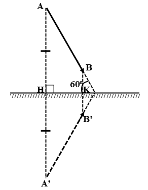 Một vật sáng AB đặt trước một gương phẳng (hình vẽ). Góc tạo bởi vật và mặt gương bằng 60 độ. Hãy vẽ ảnh của vật tạo bởi gương và tìm góc tạo bởi ảnh và mặt gương.