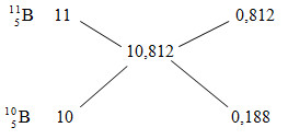Nguyên tử khối trung bình của Bo là 10,812. Bo có hai đồng vị bền: \({}_5^{11}B, {}_5^{10}B\) Thành