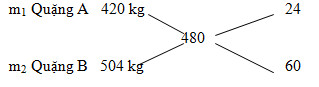 + Quặng B: \({m_B} = 1000.\dfrac{{69,6}}{{100}}.\dfrac{{168}}{{232}} = 504kg\)