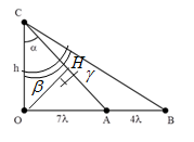 Một sóng hình sin lan truyền trên mặt nước từ nguồn O với bước sóng λ. Ba điểm A, B, C trên hai phương truyền sóng sao cho OA vuông góc với OC và B là một điểm thuộc tia OA sao cho OB > OA. Biết OA = 7λ. Tại thời điểm người ta quan sát thấy giữa A và B có 5 đỉnh sóng (kể cả A và B) và lúc này góc \(\angle ACB\) đạt giá trị lớn nhất. Số điểm dao động ngược pha với nguồn trên đoạn AC là