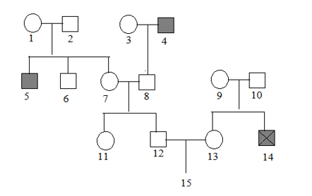 Cá thể số (4),(5) bị bệnh bạch tạng, cá thể số (14) mắc cả bệnh bạch tạng và mù màu đỏ xanh lục. biết rằng bệnh bạch tạng do gen lặn a nằm trên NST thường quy định, bệnh mù màu đỏ - xanh lục do gen b nằm trên vùng không tương đồng của NST X quy định. Xác suất cá thể số (15) không mang alen bệnh là bao nhiêu ?