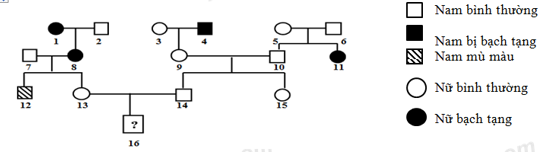Người, bệnh bạch tạng do gen lặn nằm trên NST thường quy định, alen trội tương ứng quy định da bình thường. bệnh mù màu đỏ - xanh lục do gen lặn nằm trên vùng không tương đồng của NST giới tính X quy định, alen trội tương ứng quy định mắt nhìn màu bình thường. Cho sơ đồ phả hệ sau: