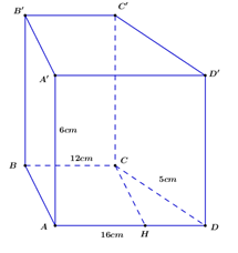 Cho hình lăng trụ đứng \(ABC\text{D}.A'B'C'D'\) có đáy là hình thang vuông ABCD vuông tại A, B \(\left( A\text{D}\parallel BC \right)\) và BC = 12 cm, AD = 16 cm, CD = 5 cm, đường cao \(\text{AA}'=6\ cm\). Thể tích của hình lăng trụ là: