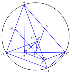 1. Cho tam giác ABC \(\left( AB<AC \right)\) có ba góc nhọn nội tiếp đường tròn \(\left( O \right)\) AH là đường cao của tam giác ABC. Kẻ đường kính AD của đường tròn \(\left( O \right)\) Từ hai điểm B và C kẻ \(BE\bot AD\) tại E, \(CF\bot AD\) tại F.