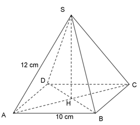 Cho hình chóp tứ giác đều S.ABCD có cạnh đáy AB = 10 cm, cạnh bên SA = 12 cm. Tính chiều cao của