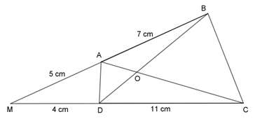 Cho tứ giác ABCD có 2 đường chéo AC và BD cắt nhau tại O. Các đường thẳng AB và CD cắt nhau tại M. Biết AB = 7 cm, CD = 11 cm, MA = 5 cm, MD = 4 cm. Chứng minh: