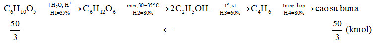 \(Xenlulozo\xrightarrow[{H1 = 35\% }]{{ + {H_2}O,{\text{ }}{{\text{H}}^ + }}}Glucozo\xrightarrow[{H2 = 80\% }]{{men,30 - {{35}^o}C}}E\tan ol\xrightarrow[{H3 = 60\% }]{{{t^o},xt}}Buta - 1,3 - dien\xrightarrow[{H4 = 80\% }]{{trung{\text{ }}hop}}Cao\,su\,buna\)