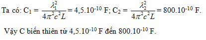 Mạch chọn sóng của một máy thu thanh gồm một cuộn dây có độ tự cảm L = 2.10-6 H, tụ điện có điện dung C thay đổi được, điện trở thuần R = 0. Để máy thu thanh thu được các sóng điện từ có bước sóng từ 57 m đến 753 m thì tụ điện phải có điện dung thay đổi trong khoảng nào? Cho c = 3.108 m/s.