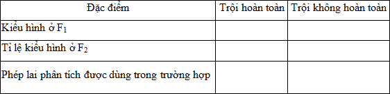 Thế nào là hiện tượng “Trội không hoàn toàn” ? So sánh hiện tượng trội hoàn toàn và không hoàn toàn theo bảng sau :