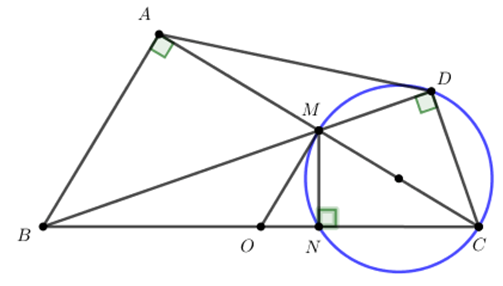 Cho tam giác ABC vuông tại A, M là trung điểm của cạnh AC. Vẽ đường tròn đường kính MC cắt cạnh BC tại N \(\left( N\ne C \right).\) Đường thẳng BM cắt đường tròn đường kính MC tại D \(\left( D\ne M \right).\) Chứng minh: