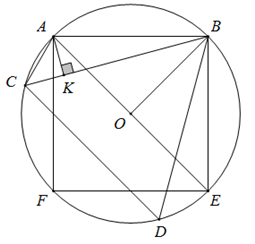 Cho đường tròn (O;R) ngoại tiếp tam giác BCD và ngoại tiếp hình vuông ABEF sao cho A và C cùng phía đối với OB. AK ⊥ BC tại K. Tỉ số \(\frac{{AK}}{R}\) gần nhất với giá trị nào sau đây?