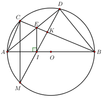 Cho đường tròn \(\left( O \right)\) đường kính AB và điểm C trên đường tròn \(\left( C\ne A;C\ne B \right)\) Gọi D là một điểm trên cung nhỏ \(CB\,\,\left( D\ne C;D\ne B \right)\) ; E là giao điểm của AD và BC; I là hình chiếu vuông góc của E trên AB; M là điểm thứ hai của đường thẳng DI và đường tròn \(\left( O \right)\)