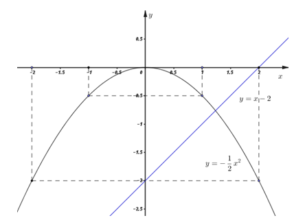 1) Trong mặt phẳng tọa độ \(\left( Oxy \right),\) cho hàm số \(y=-\frac{1}{2}{{x}^{2}}\) có đồ thị là parabol \(\left( P \right)\) và hàm số \(y=x-2\) có đồ thị là đường thẳng \(d.\) Vẽ đồ thị \(\left( P \right)\) và \(d\) trên cùng một hệ trục tọa độ.