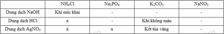 (Phần chung) Bằng phương pháp hóa học hãy phân biệt 4 dung dịch đựng trong các lọ mất nhãn sau: NH4Cl, Na3PO4, K2CO3, NaNO3.Viết phương trình hóa học xảy ra.