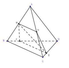 Cho tứ diện \(ABCD\). Gọi \(M,\,N\)lần lượt là trung điểm của \(AB,\,\,AC\). \(E\) là điểm trên