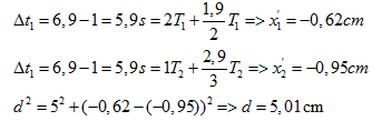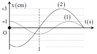Hai chất điểm dao động điều hòa trên hai đường thẳng song song kề nhau cách nhau 5 cm và cùng song song với trục Ox. Đồ thị biểu diễn li độ của hai chất điểm theo thời gian như hình vẽ. Tại thời điểm t = 0, chất điểm (1) ở vị trí biên. Khoảng cách giữa hai chất điểm ở thời điểm t = 6,9 s xấp xỉ bằng