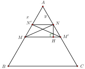 Cho tam giác đều \(ABC\) có cạnh bằng \(a.\) Hai điểm \(M,\;N\) lần lượt di động trên hai đoạn thẳng \(AB,\;\;AC\) sao cho \(\frac{{AM}}{{MB}} + \frac{{AN}}{{NC}} = 1.\) Đặt \(AM = x\) và \(AN = y.\) Chứng minh: \(MN = a - x - y.\)