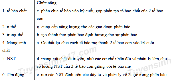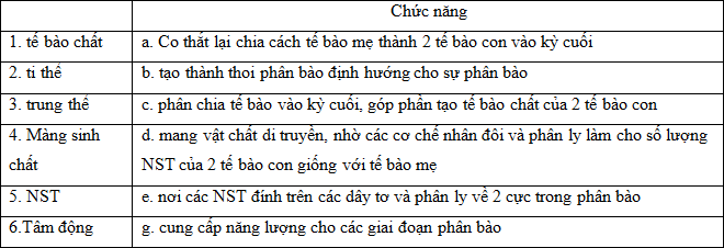 Cho các thành phần cấu trúc sau đây và các chức năng kèm theo Hãy sắp xếp đúng các chức năng