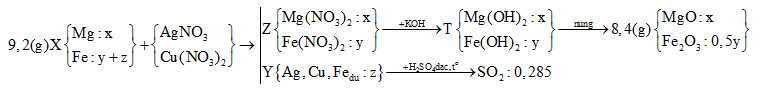 Cho 9,2 gam hỗn hợp X gồm Mg và Fe vào dung dịch hỗn hợp AgNO3 và Cu(NO3)2, thu được chất rắn Y