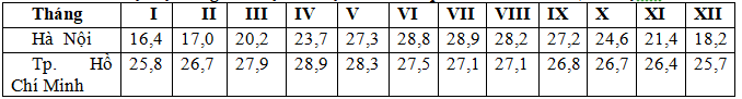 Cho bảng số liệu: Nhiệt độ trung bình tại Hà Nội và Thành phố Hồ Chí Minh (Đơn