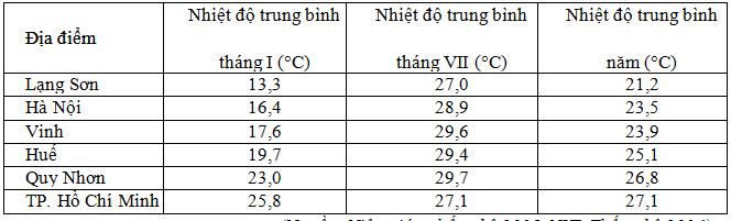 Cho bảng số liệu sau: Nhiệt độ trung bình một số địa điểm (Nguồn: Niên giám thống kê