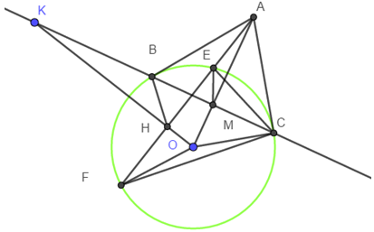 Từ điểm K nằm ngoài đường tròn vẽ cát tuyến KBC với đường tròn (không qua O) và B nằm giữa K và C. Tiếp tuyến tại B và C cắt nhau tại A. Qua A vẽ đường vuông góc với KO cắt KO tại H, cắt (O) tại E và F biết E nằm giữa A và F. Gọi M là giao điểm AO và BC. Chứng minh rằng: