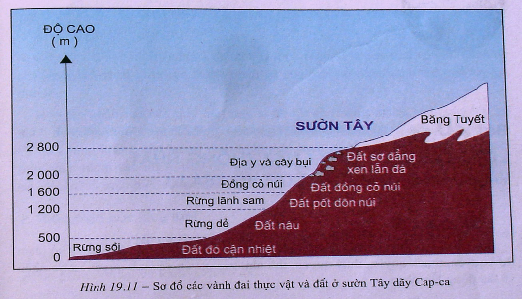 Dựa vào hình 19.11 và kiến thức đã học, giải thích tại sao ở độ cao từ 2000m đến 2800m ở sườn Tây dãy Cap-ca thực vật chủ yếu là địa y và cây bụi lại hình thành đất sơ đẳng xen lẫn đá?