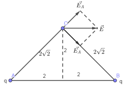 Cho hai điện tích q1=\({8.10^{ - 8}}C\), q2=\( - {8.10^{ - 8}}C\) đặt tại A, B trong không khí, AB=4cm. Tìm véc tơ cường độ điện trường tổng hợp do hai điện tích gây ra tại C nằm trên đường trung trực của AB, cách AB 2cm, suy ra lực điện tác dụng lên điện tích q=\({2.10^{ - 9}}C\) đặt ở C.