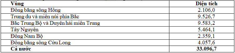 Theo bảng số liệu trên, hãy cho biết nhận xét nào sau đây đúng về diện tích đất phân theo vùng năm 2014 của Việt Nam.