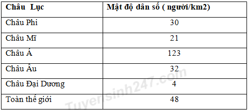 Cho bảng số liệu sau: Diện tích, dân số thế giới và các châu lục, năm 2005 a. Tính mật độ