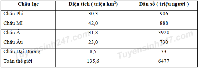 Cho bảng số liệu sau: Diện tích, dân số thế giới và các châu lục, năm 2005
