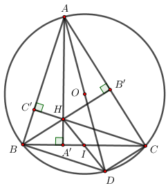 Cho tam giác ABC có ba góc nhọn nội tiếp đường tròn tâm O. Các đường cao AA’, BB’, CC’ của tam giác ABC cắt nhau tại H. Đường thẳng AO cắt đường tròn tâm O tại D khác A.
