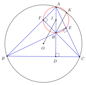 a) Gọi \(I\) là trung điểm của \(AH,\) chứng minh \(AEHF\) nội tiếp đường tròn \(\left( I \right).\)