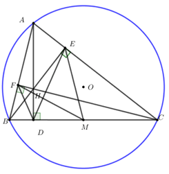Cho tam giác nhọn ABC (AB < AC) nội tiếp đường tròn (O; R). Các đường cao AD, BE, CF của tam giác ABC cắt nhau tại H. Gọi M là trung điểm của BC.