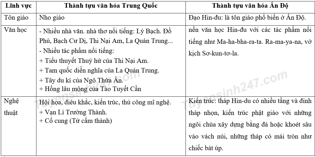 Lập bảng tóm tắt những thành tựu về văn hoá của Trung Quốc và Ấn Độ thời phong kiến (tôn giáo, văn học, nghệ thuật)?