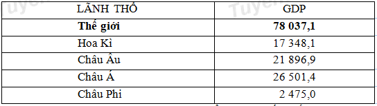 Cho bảng số liệu: GDP CỦA THẾ GIỚI, HOA KÌ VÀ MỘT SỐ CHÂU LỤC KHÁC NĂM 2014 Năm 2014, tỉ
