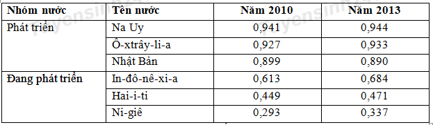 Cho bảng số liệu: CHỈ SỐ HDI CỦA MỘT SỐ NƯỚC TRÊN THẾ GIỚI NĂM 2010 VÀ 2013. Nhận xét