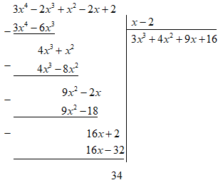 Số dư khi chia đa thức: \(3{x^4} - 2{x^3} + {x^2} - 2x + 2\) cho đa thức \(x - 2\) là: