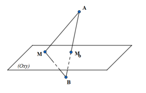 Lấy \(M \in \left( {Oxy} \right) \Rightarrow MA + MB \ge AB \Rightarrow {\left( {MA + MB} \right)_{\min }} = AB\) khi và chỉ khi \(M\) là giao điểm của AB và mặt phẳng (Oxy)