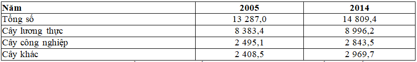 Để thể hiện quy mô diện tích các loại cây trồng và cơ cấu của nó qua hai năm 2005 và 2014, biểu đồ nào sau đây thích hợp nhất?