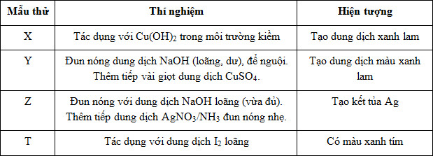 Tiến hành thí nghiệm với các chất X, Y, Z, T. Kết quả được ghi ở bảng sau: