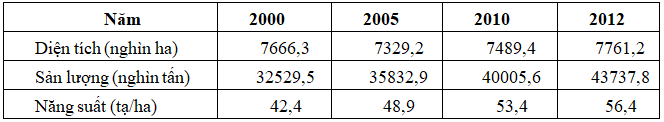 Cho bảng số liệu sau: DIỆN TÍCH, SẢN LƯỢNG VÀ NĂNG SUẤT LÚA Ở NƯỚC TA GIAI ĐOẠN 2000 -