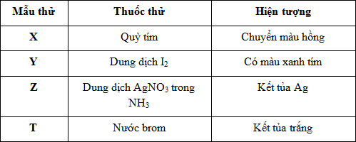 Kết quả thí nghiệm của các dung dịch X, Y, Z, T với thuốc thử được ghi ở bảng sau: