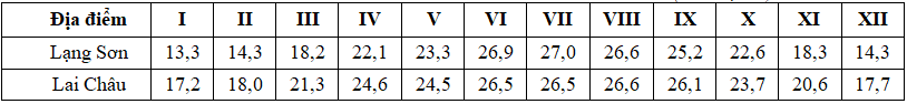Cho bảng số liệu: NHIỆT ĐỘ TRUNG BÌNH CÁC THÁNG CỦA LẠNG SƠN VÀ LAI CHÂU