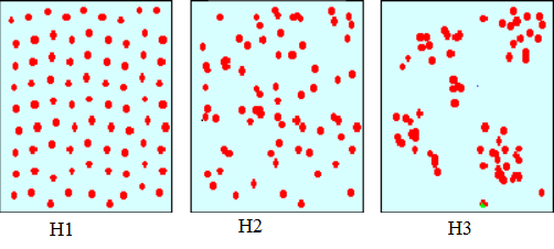 Cho 3 hình 1,2,3 diễn tả kiểu phân bố của cá thể trong quần thể